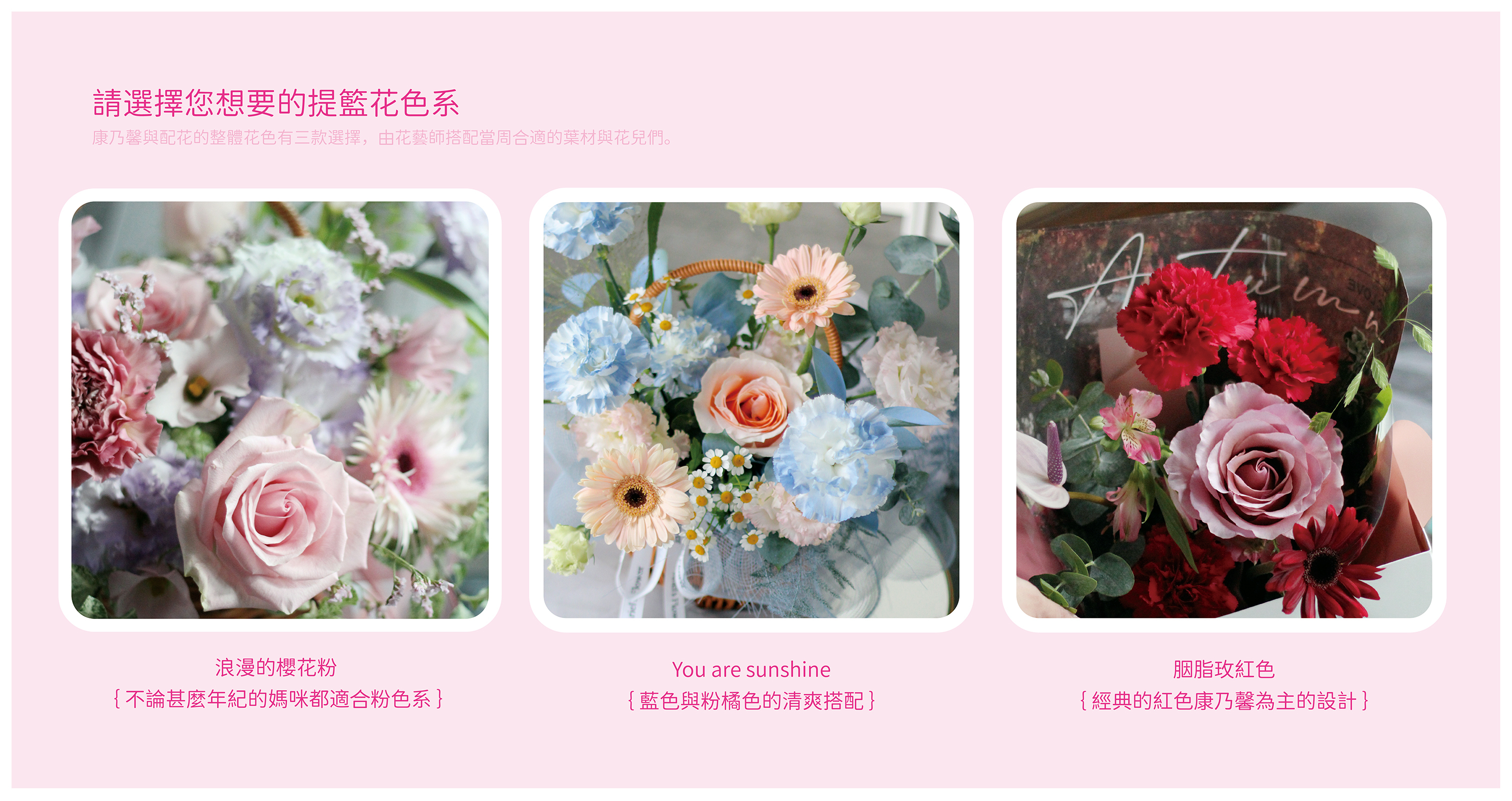 ● 花色:浪漫的櫻花粉、You are sunshine、胭脂玫紅色 ,選擇想要的色系由花藝師為您搭配設計