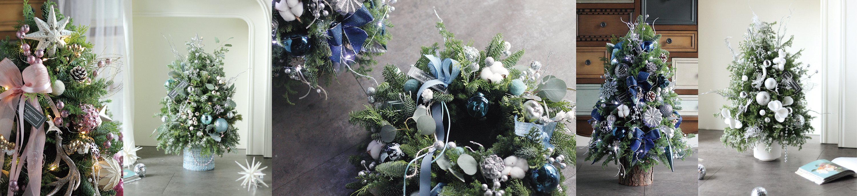 『裝飾款聖誕樹 - 奶霜白與斜紋軟呢藍』聖誕樹 Noble FirCedar Christmas Tree 兩款不同顏色的設計,推薦給喜歡淺色系的朋友。