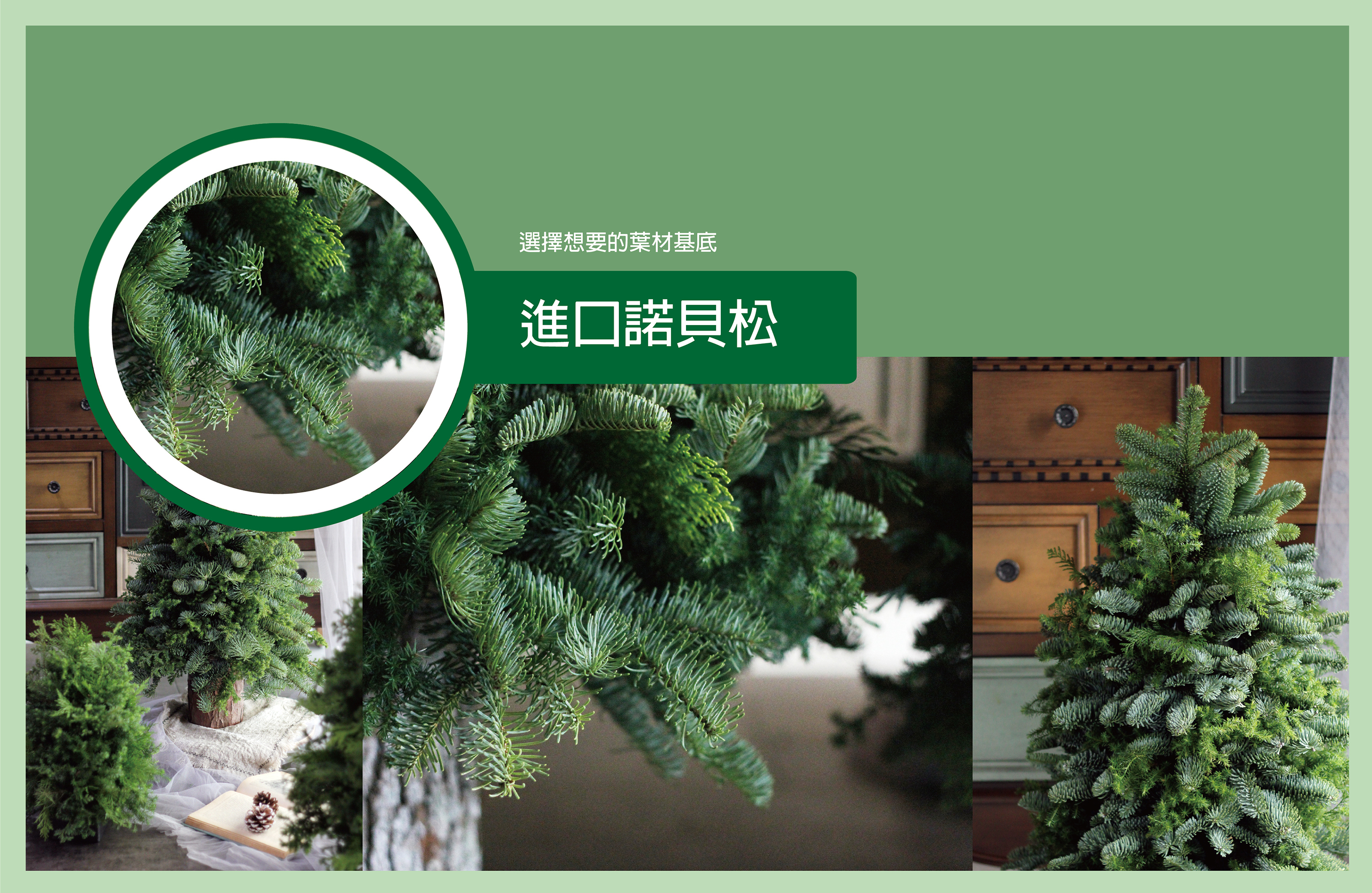 聖誕燭台花主要採用進口諾貝松與新鮮雪松和各式松柏類,剪枝插在花藝海綿上,請選擇您想要的葉材基底:「台灣雪松」或是「進口諾貝松」