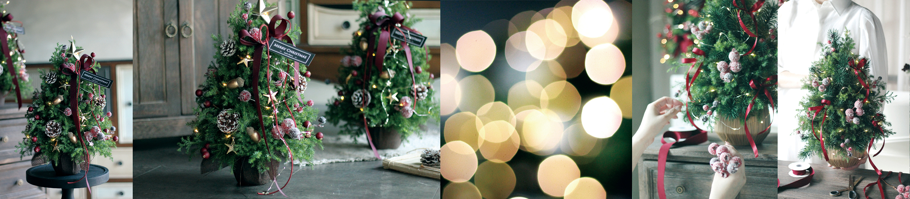 聖誕樹主要採用新鮮雪松與各式松柏類,剪枝插在花藝海綿上,請選擇您想要的樹款基底:「台灣雪松」或是「進口諾貝松」
