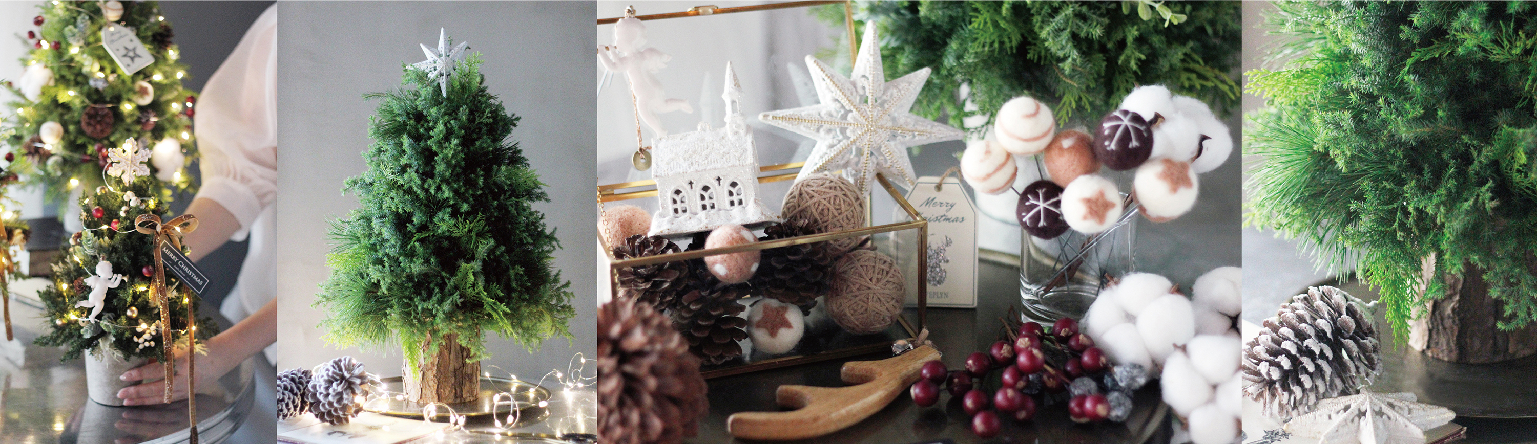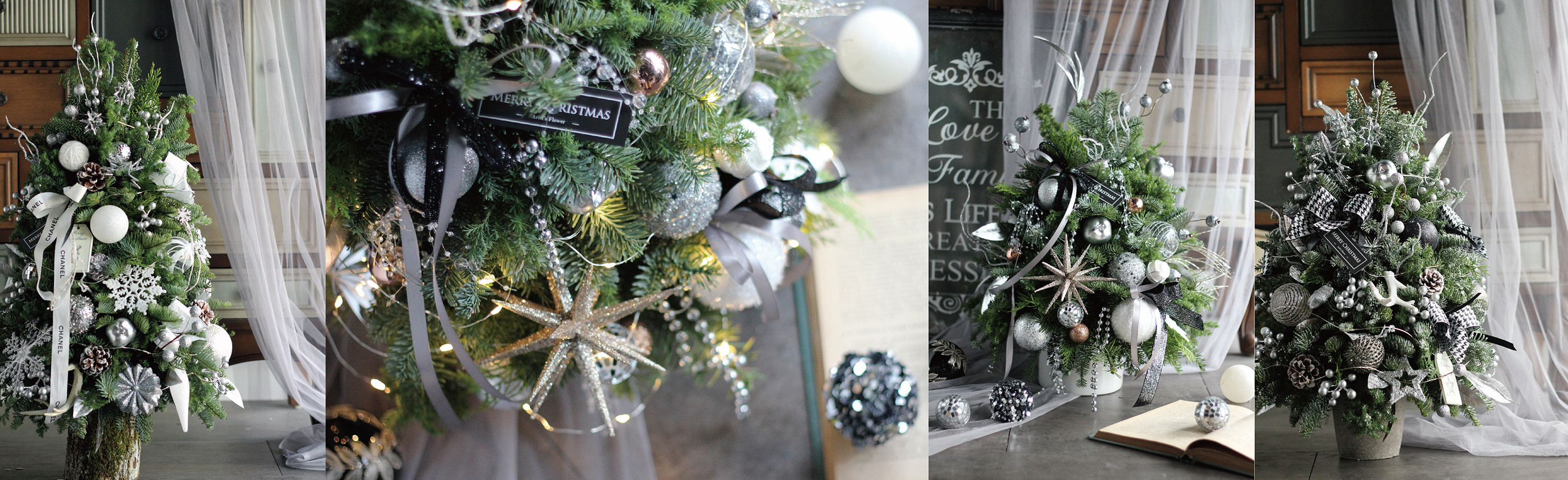 聖誕樹主要採用新鮮雪松與各式松柏類,剪枝插在花藝海綿上完成樹體後再裝飾各類節慶感飾品。